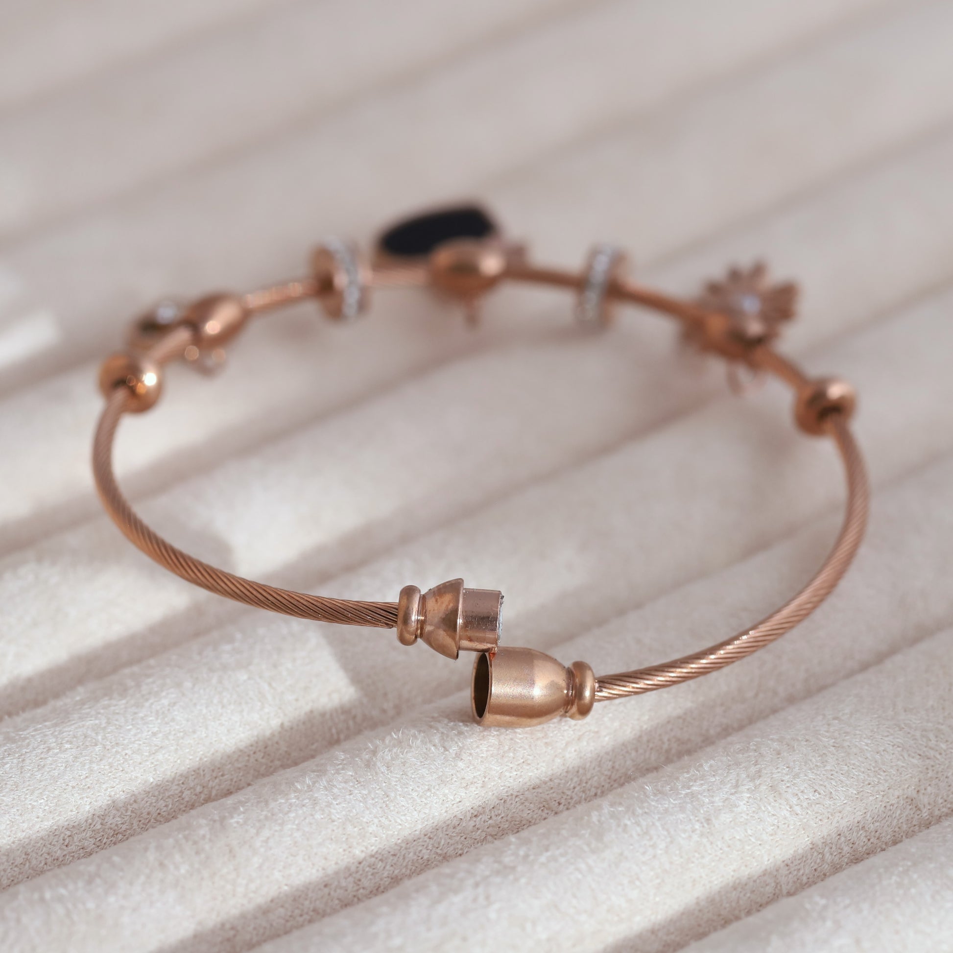 Crafted with high-quality stainless steel and finished in radiant 18K rose gold plating, this bracelet is designed in an oval kada shape with an inner width of 2.5 inches and height of 2 inches. Its magnetic lock ensures easy wear and a secure fit for women who appreciate comfort and class.