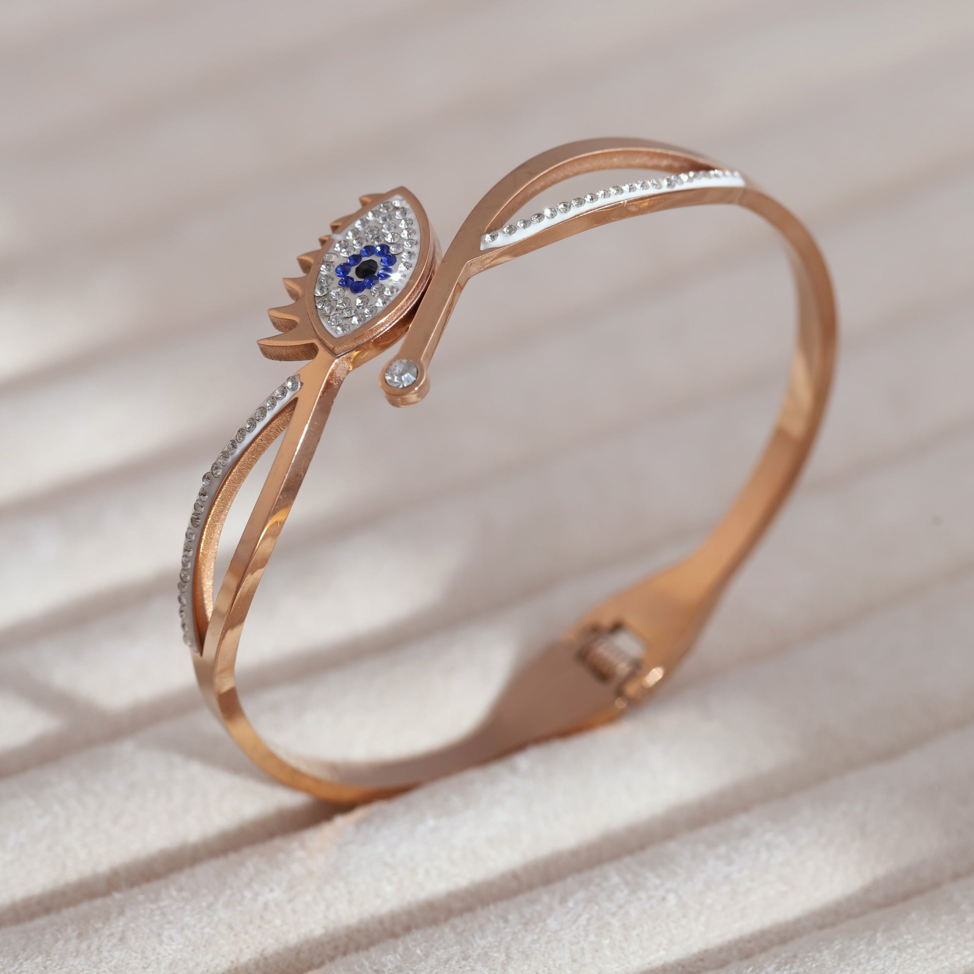Evil Eye Gold-Plated Cuff Stainless Steel Bracelet – Anti-Tarnish Jewelry for Women & Girls (ROSE GOLD)