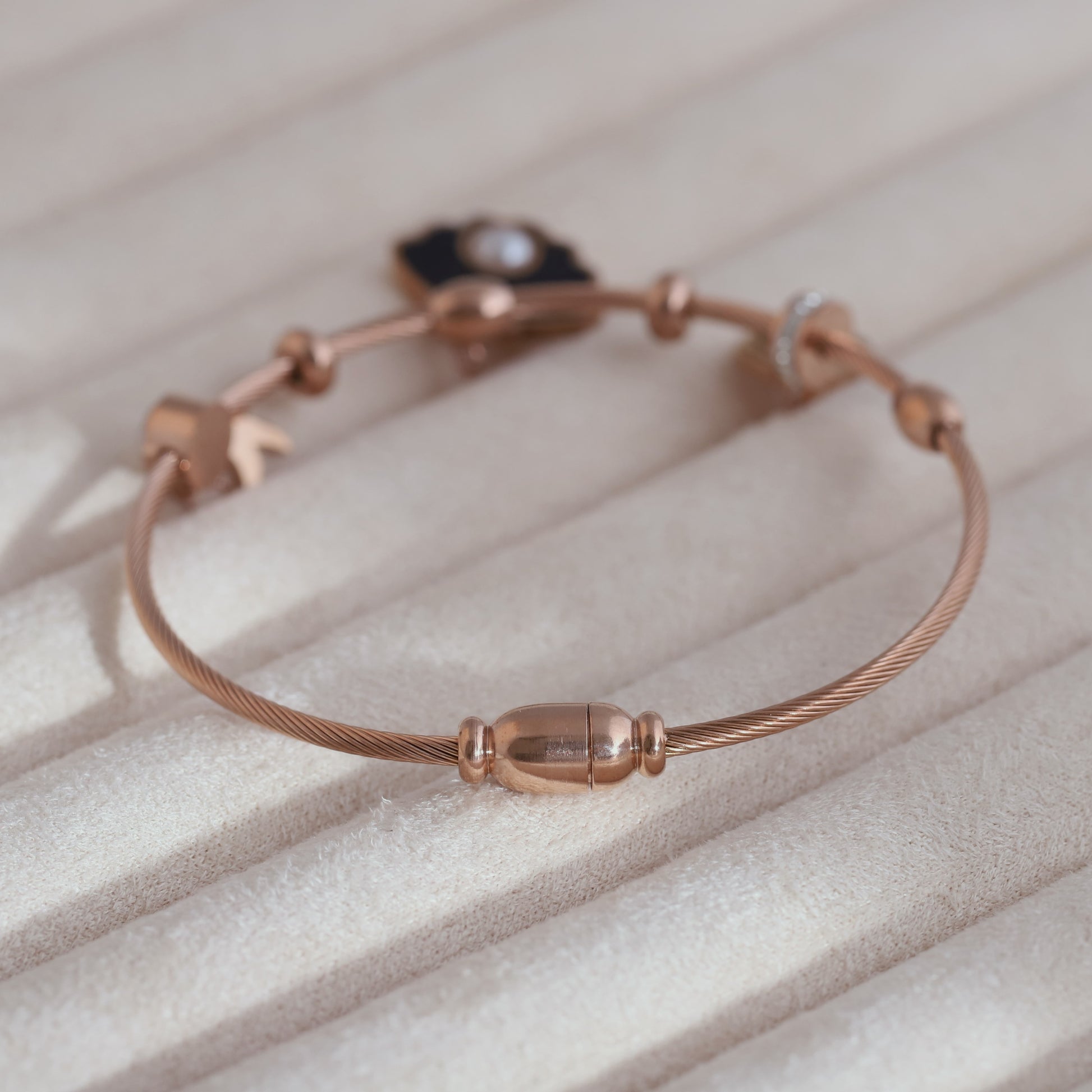 Crafted from high-quality stainless steel, the bracelet is coated in a rich 18K rose gold finish and shaped in an oval kada style with an inner width of 2.5 inches and height of 2 inches. The easy-to-use magnetic lock ensures secure wear with a seamless finish—perfect for everyday wear or special occasions.